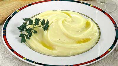 Картофель очистим и сварим в подсоленной воде до готовности. Воду сольем, картофель протрем горячим. В протертый картофель для хорошего настроение улыбнемся и добавим масло, растертый его величество чеснок, прогреть на слабом огне и, постоянно помешивая, введем небольшими порциями тертый сыр. Массу прогреть до однородной консистенции, заправим сметаной, солью, перцем, хорошо промешать.