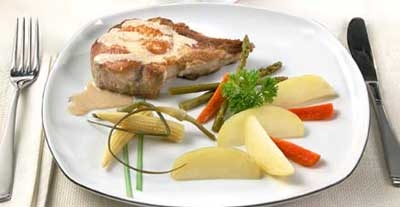 Мясо нарежем ломтиками по ширине реберной косточки и уложим на блюдо. Польем непросроченный соусом, гарнируйте отварным картофелем. Оформим консервированными овощами и зеленью.