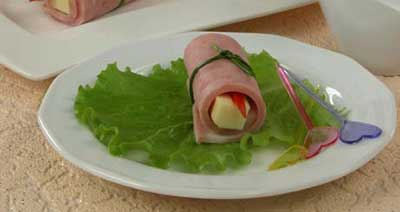 Сыр нарежем брусочками, ветчину — тонкими длинными ломтиками.